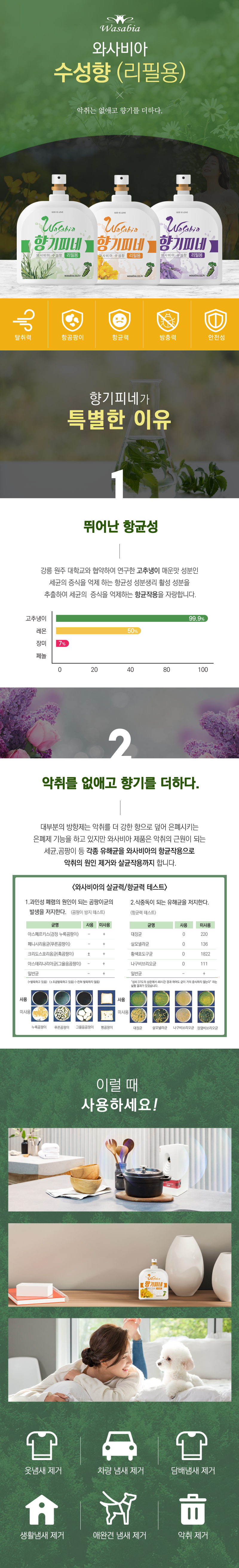 - 고추냉이 특허오일의 강력한 작용으로 악취의 근원인 원인균을 원천적으로 차단하여 더욱 안전합니다.